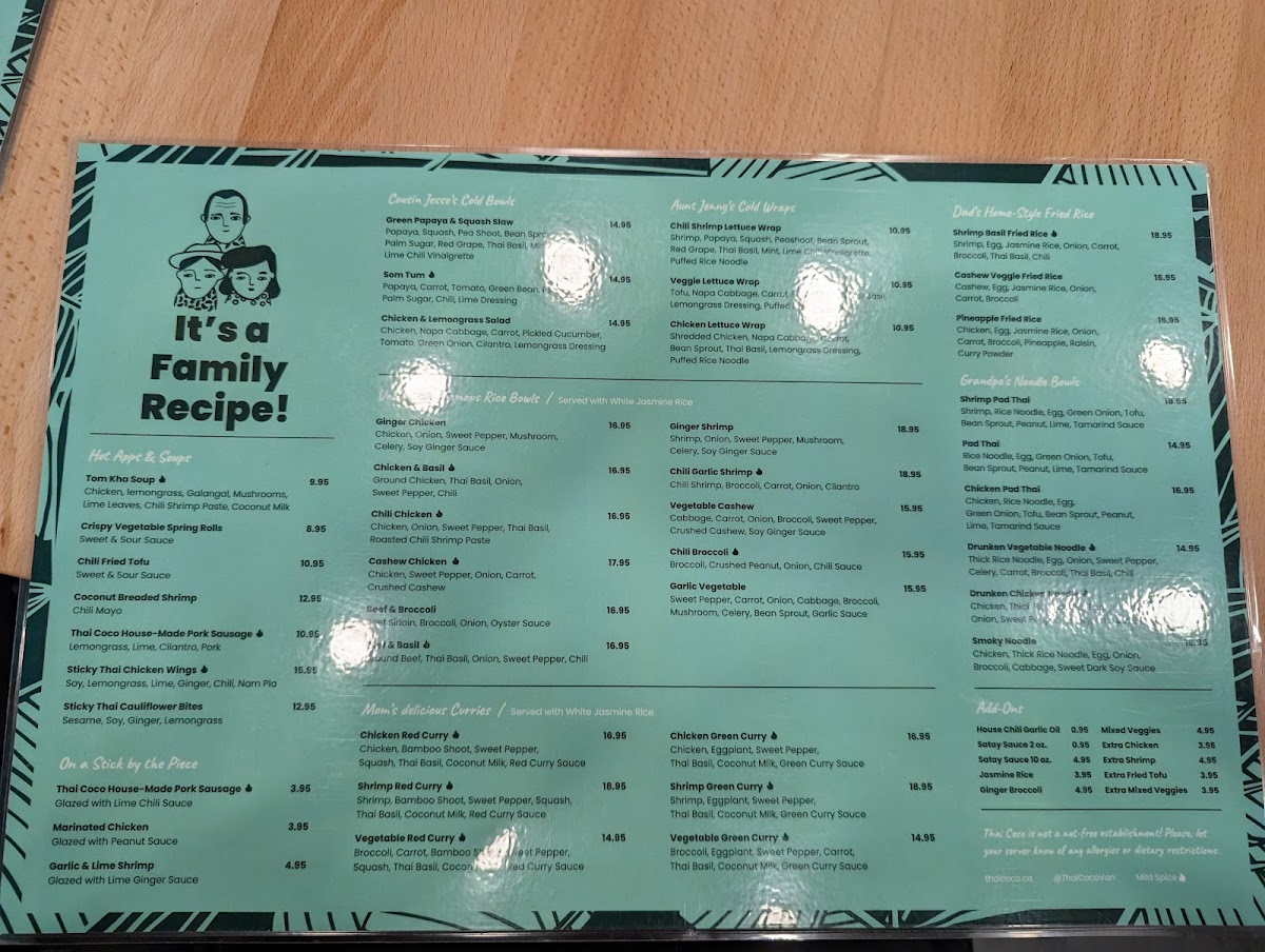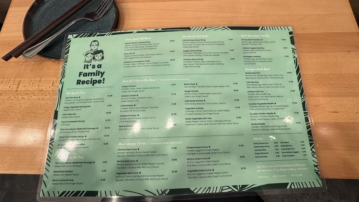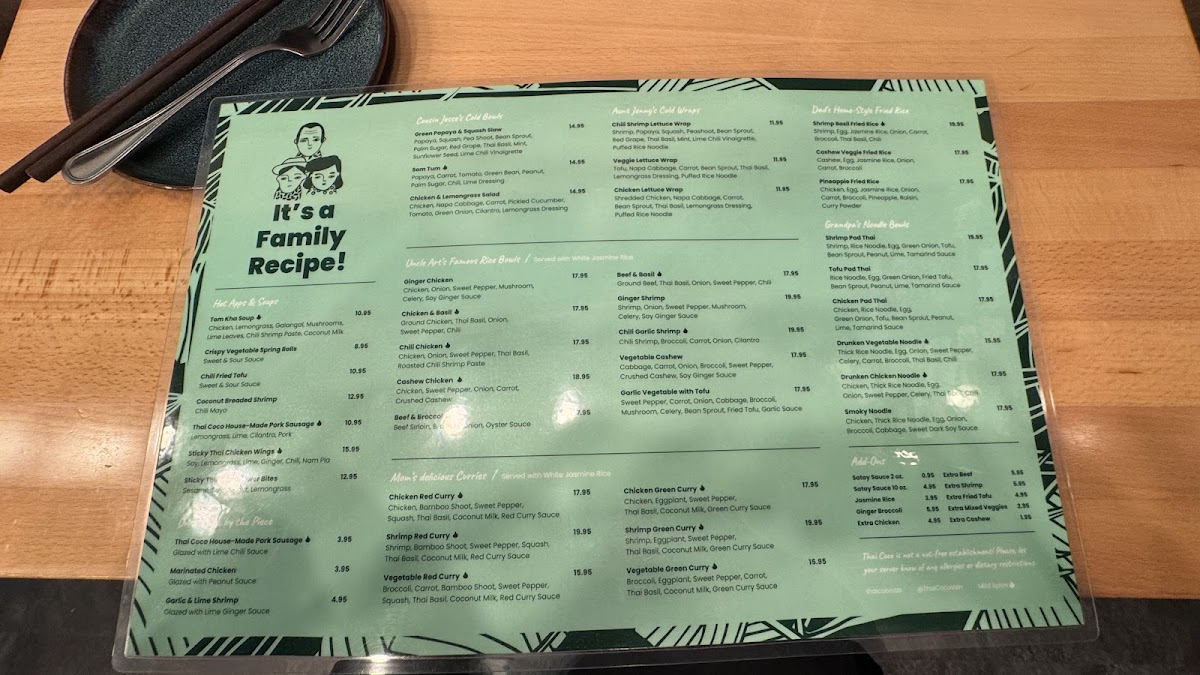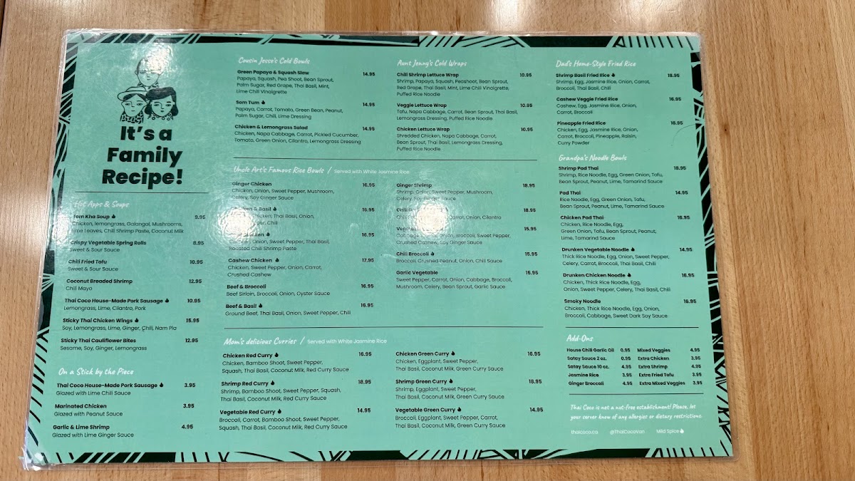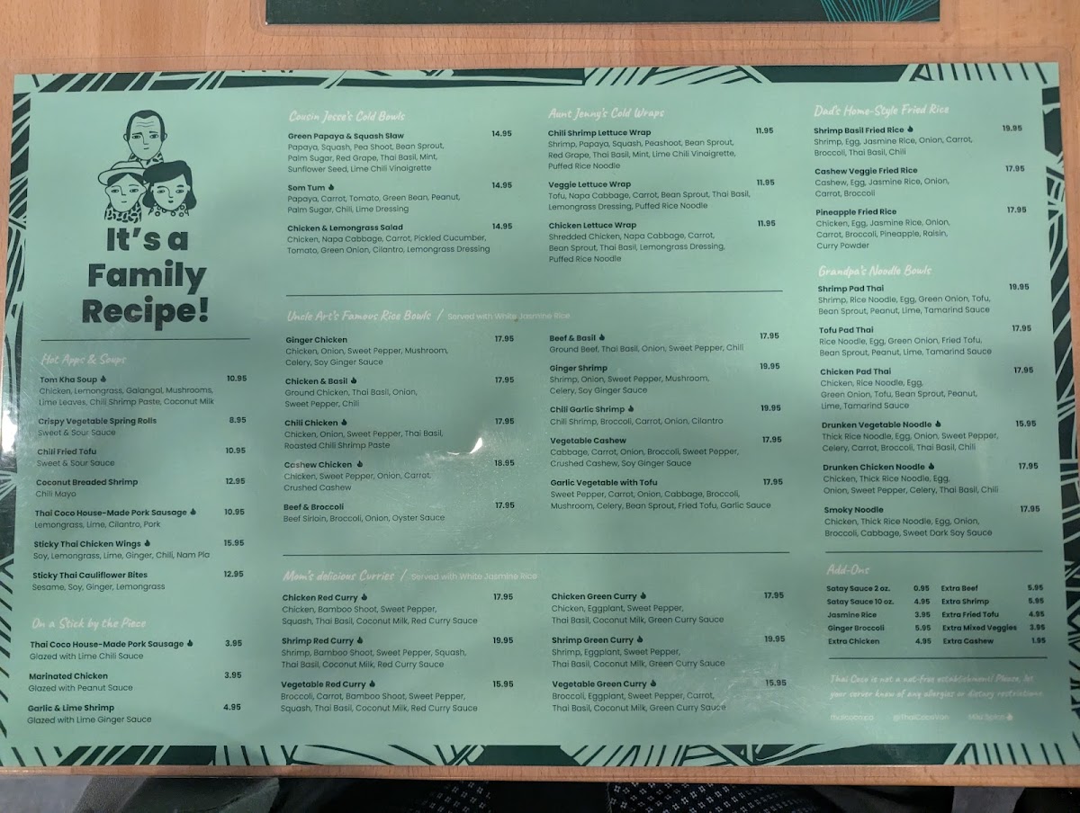 Whether you prefer Aunt Jenny's Cold Wraps, Uncle Art's Famous Rice Bowls, Mom's Delicious Curries, Dad's Home-Style Fried Rice, or Grandpa's Noodle Bowls, Thai Coco has something for everyone.