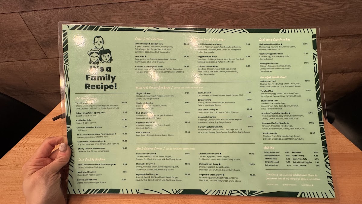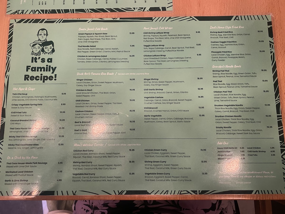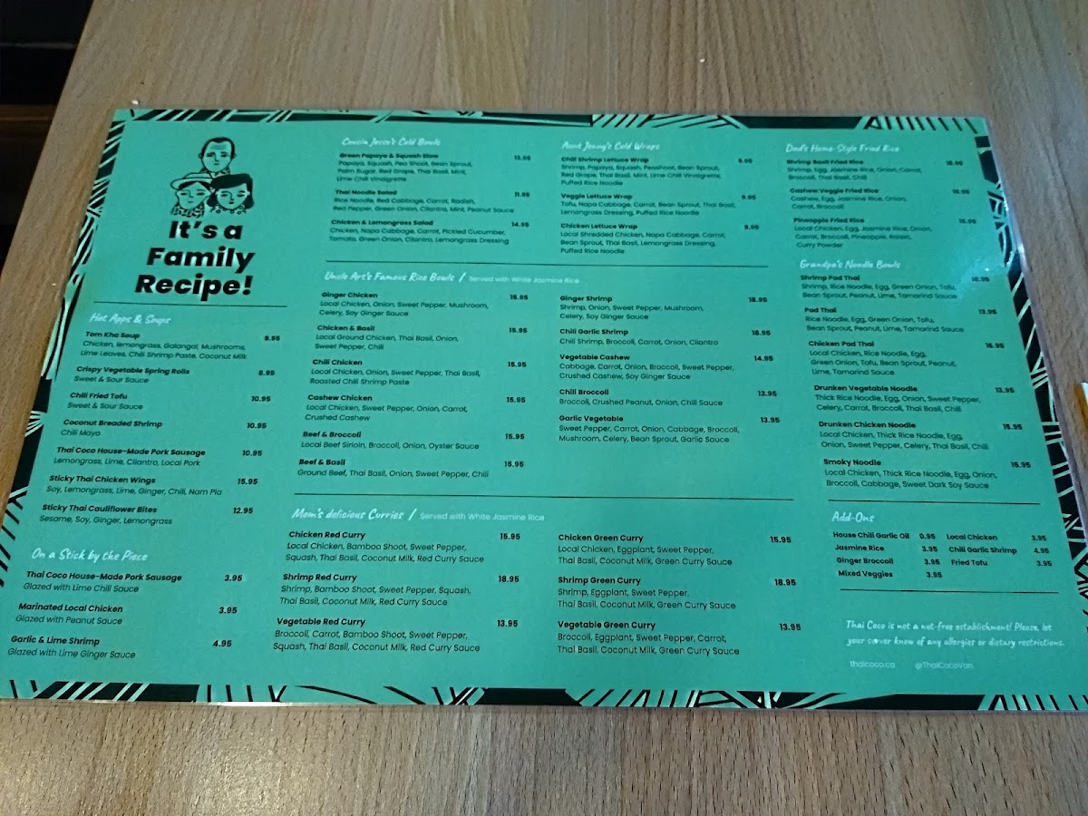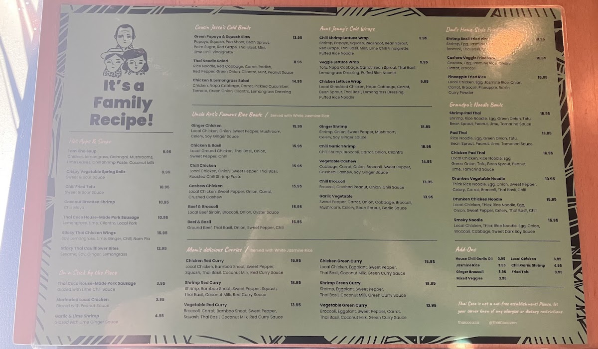 Whether you prefer Aunt Jenny's Cold Wraps, Uncle Art's Famous Rice Bowls, Mom's Delicious Curries, Dad's Home-Style Fried Rice, or Grandpa's Noodle Bowls, Thai Coco has something for everyone.